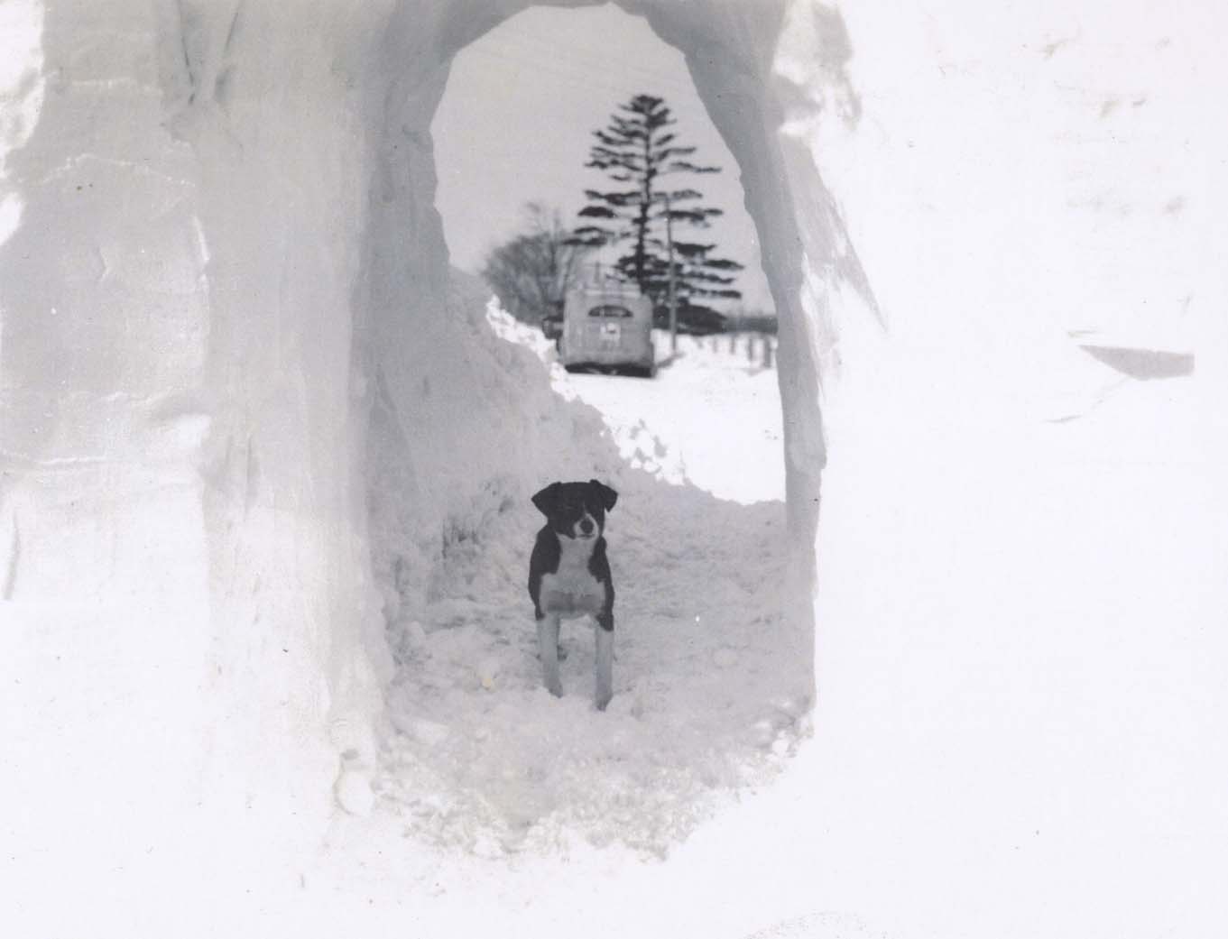 Six photos. Snow storm March 1947. A)photo During the last week of March, 1947, a terrific snow storm closed Highway 11 for 56 hours. (Photo at Knock Heritage Site). b)Buddy, Frank Jones dog, stands in the middle of the tunnel dug for pedestrians into the door of Jones Esso Garage. c) Digging the tunnel, Edward Jones, Russ Cross, Emerson Third. d) Snow plow at work. e) Shovelling out f) Hard packed snow. g) Car makes it through. h) Snow plough coming through. Photos not shown will be at the Knock Heritage Site
