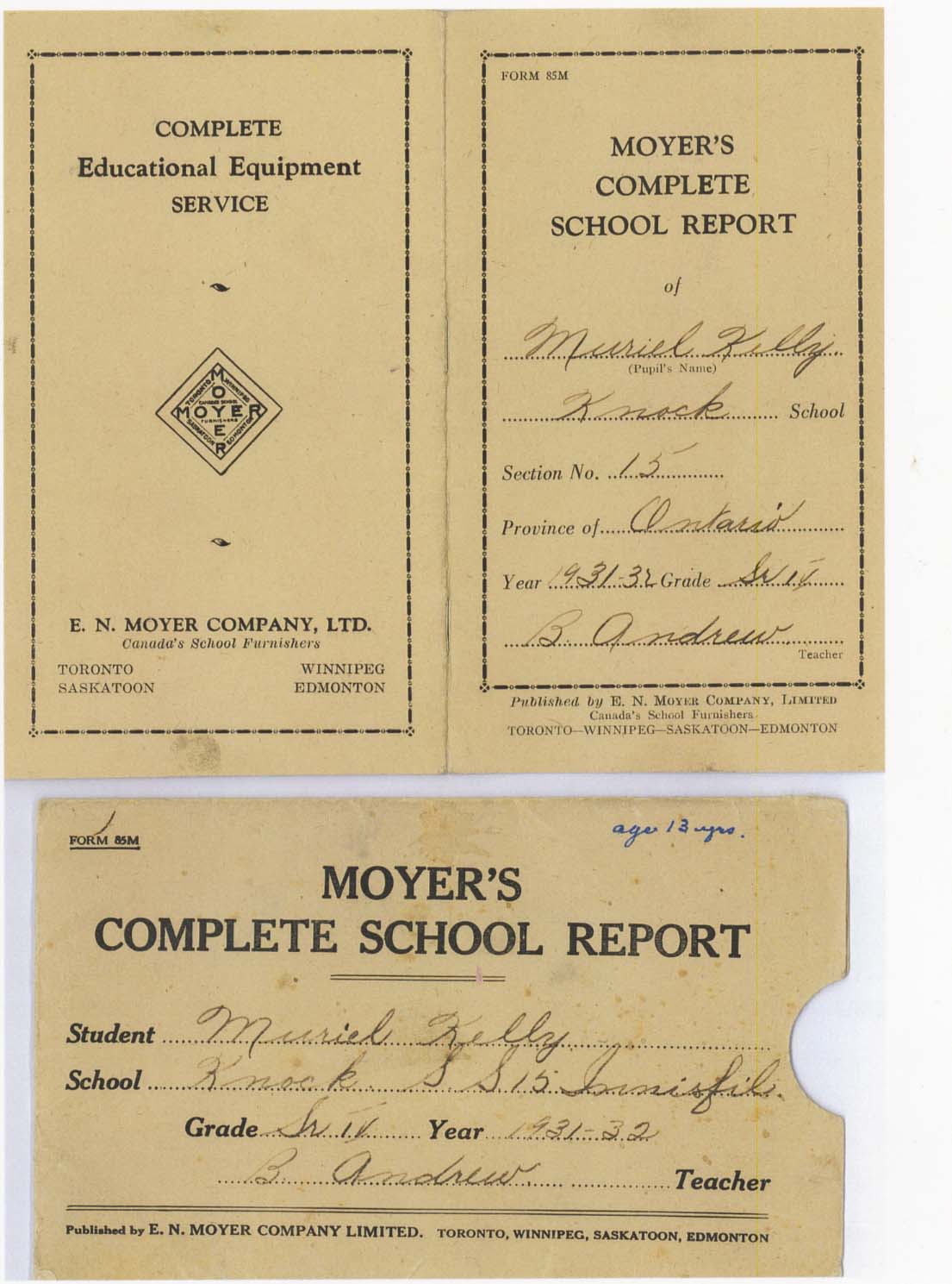 School Report Card of Muriel Kelly, Grade: Senior 1V 1931-32. Knock School S.S. #15 Innisfil, On. Further information is available at the Knock Heritage Site