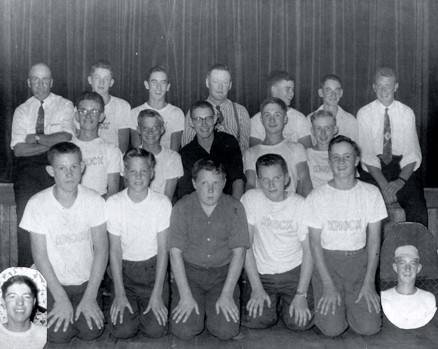 Group photo taken of Knock school's baseball team. The young men are posed in three rows and most are wearing white t-shirts with the word "Knock" written across the chest. The photo was taken indoors, in front of a stage. Pictured from left to right, back row: Manager Bruce Wice, Donald Shannon, Wayne Martin, Herb Shannon, Donald Gibbons, Selby Bowman, and Umpire Eddie Webb. Centre row: Gordon Cowan, Earl Shannon, Mike Webb, David Sturgess, and Andrew Cowan. Front row:Peter Metcalf (Inset), James Sturgess, Herb Shannon, Terry Webb, Ronald Cowan, Mervin Wice, and Ian Grey (inset).