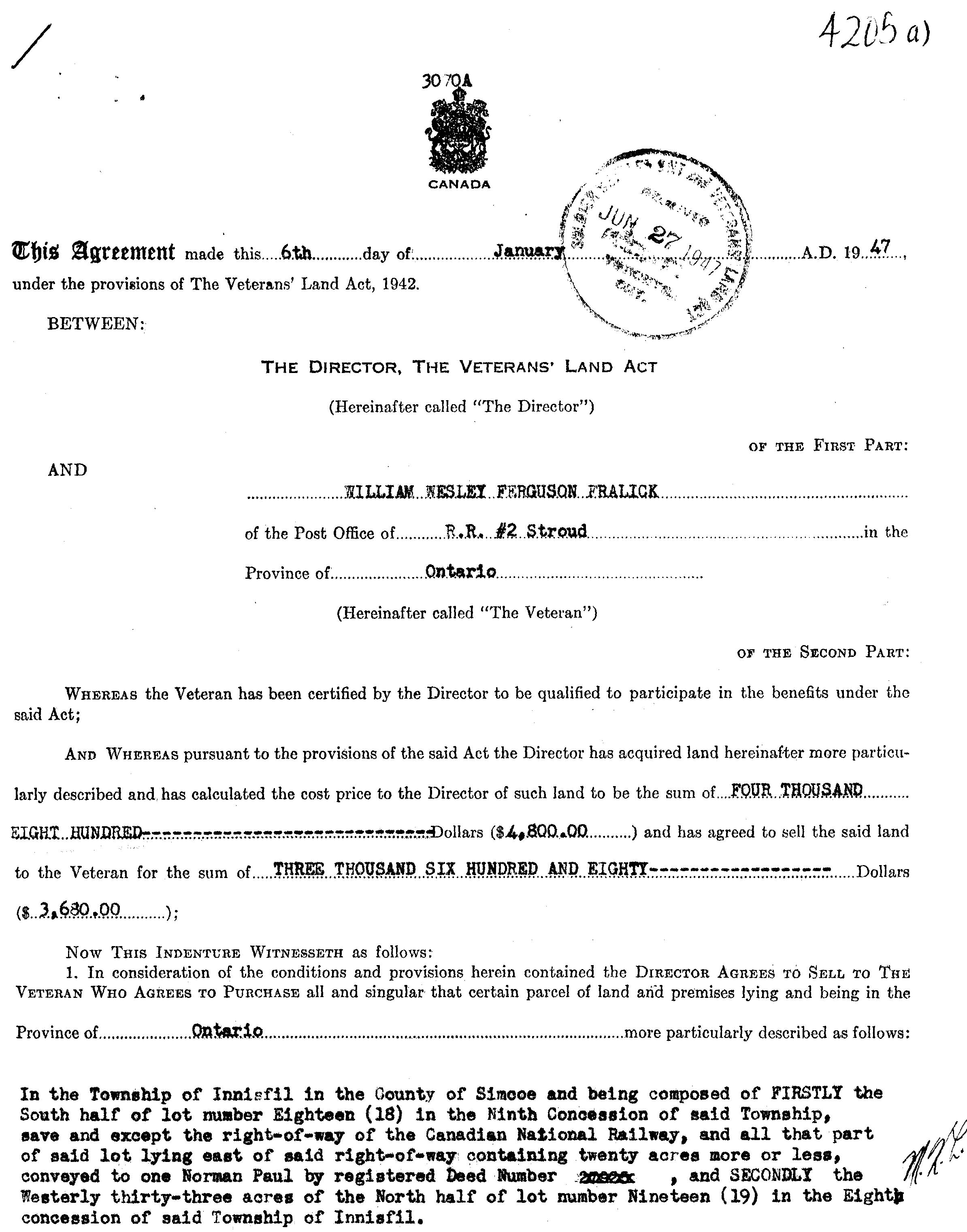 (a) Veterans' Land Act Indenture to Ferguson Fralick, January 6, 1947 for farm (b) Veterans' Land Act and soldier settlement for Allis Chalmers Tractor purchase, W.W. Ferguson Fralick, January 1949. Full copy on file at the Knock Heritage Site Document Centre.