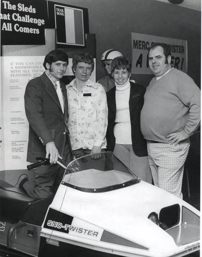 Ted and Barb Dallimore with two snowmobile racers who won many events on the new Snow Twister at Sandy Cove Marine.