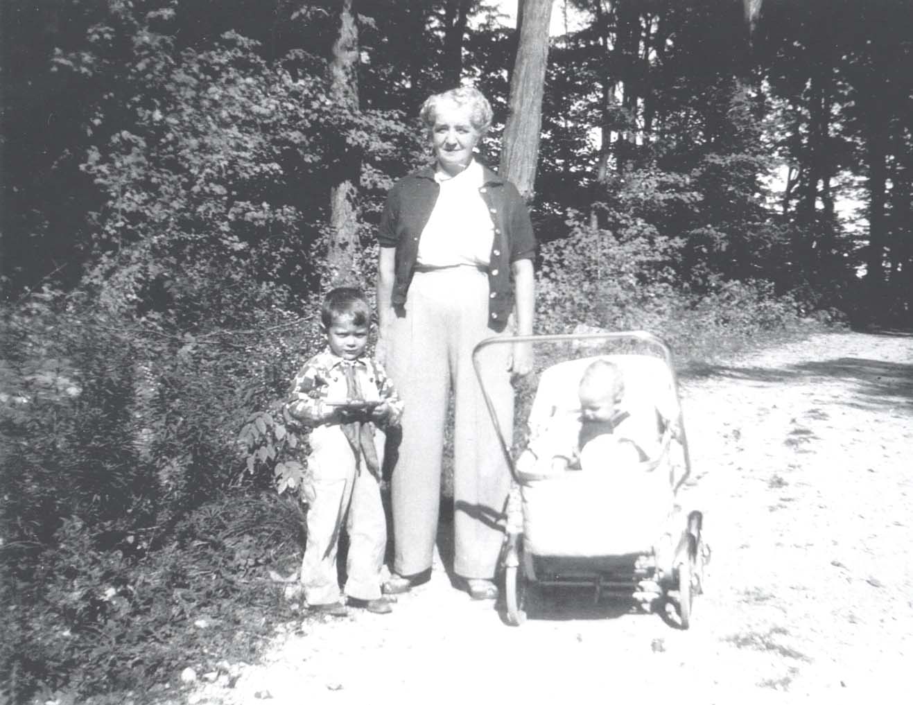 Image taken during a walk on St. John's Road, Alcona, in 1953. This road ended in a wooded area at Maplewood, where it is suspected the image was taken. Left to right: Paul Leaver, Fern Kirk, Laurel Leaver. Paul Leaver is a boy in this image and appears to be holding a toy in his hand. He stands next to Fern Kirk who is wearing pants and a cardigan. Laurel Leaver is in a stroller, as she is only a baby at this time.
