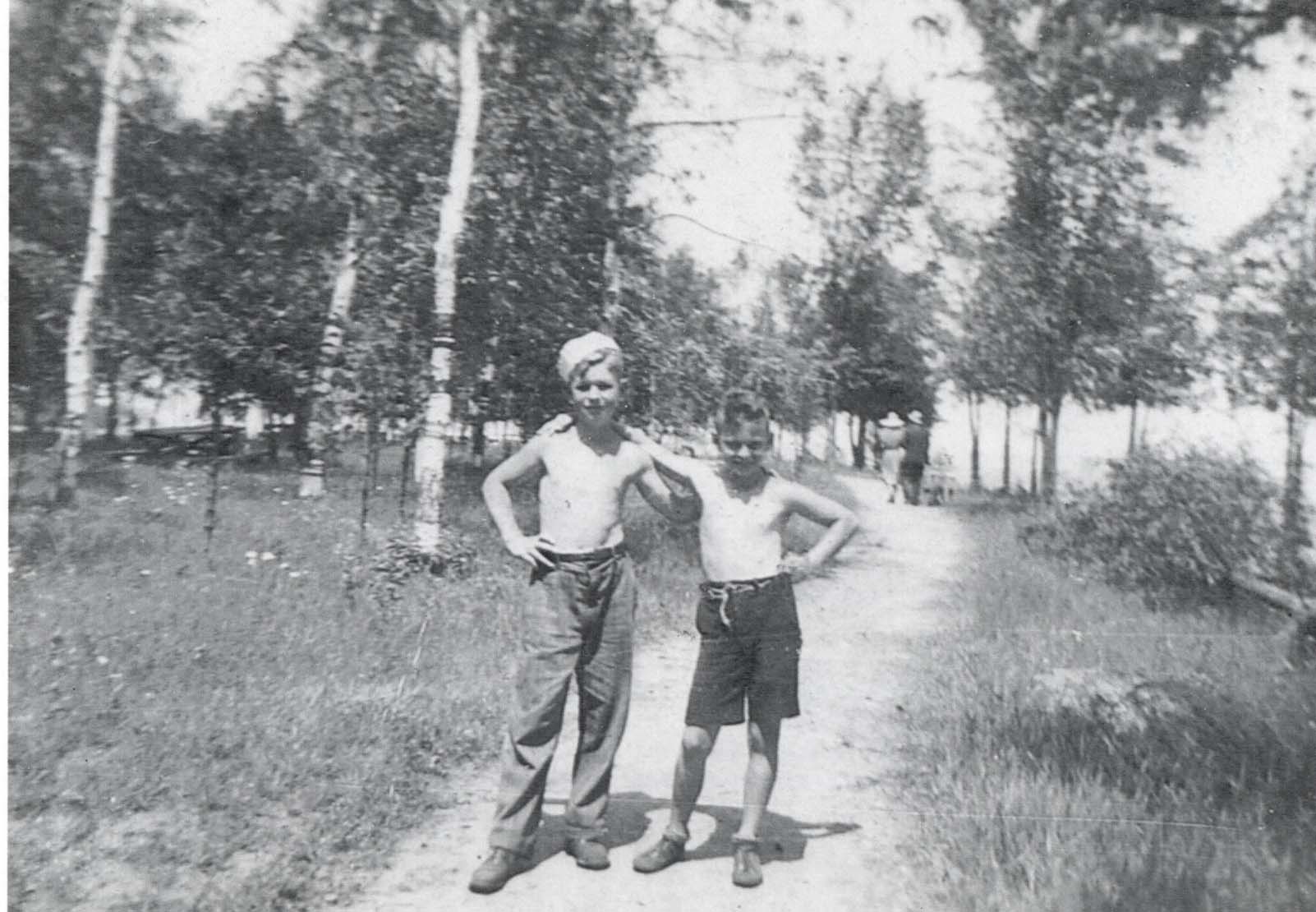 Image of two boys taken in 1947 at Innisfil Park. From left to right: Alan Dawson, Don Wesson. The two boys were 13 years old in this image and are both from Cookstown. The boys are both wearing their pants and shoes, with no shirts. They were allegedly enjoying a walk along the shoreline path of Innisfil Path. The Dawson family had rented a nearby cottage for a week holiday.
