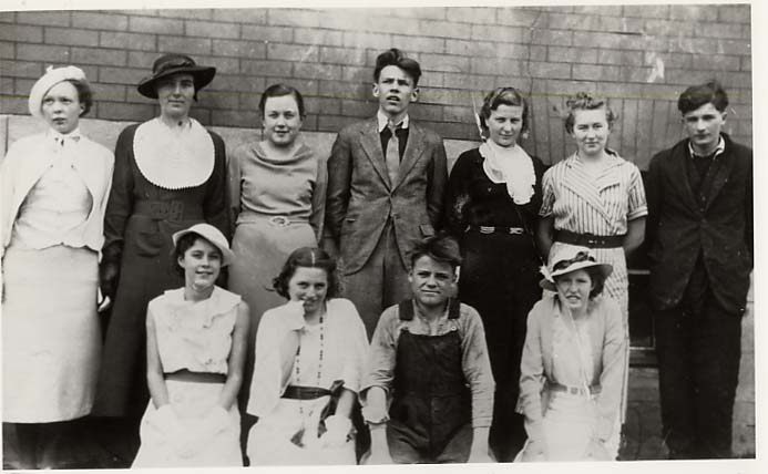 Occassion of a play. Back row left to right: Marie Trombley, Luella Donnelly, Grace Allan, Everett Cooke, Leone Wice, Dorothy Reid, Lloyd Ruffett. Front row: left to right: Marguerite Jacks, Brooks, Bill Sheldon, Betty Montgomery. Further information is available at the Document Centre at Knock