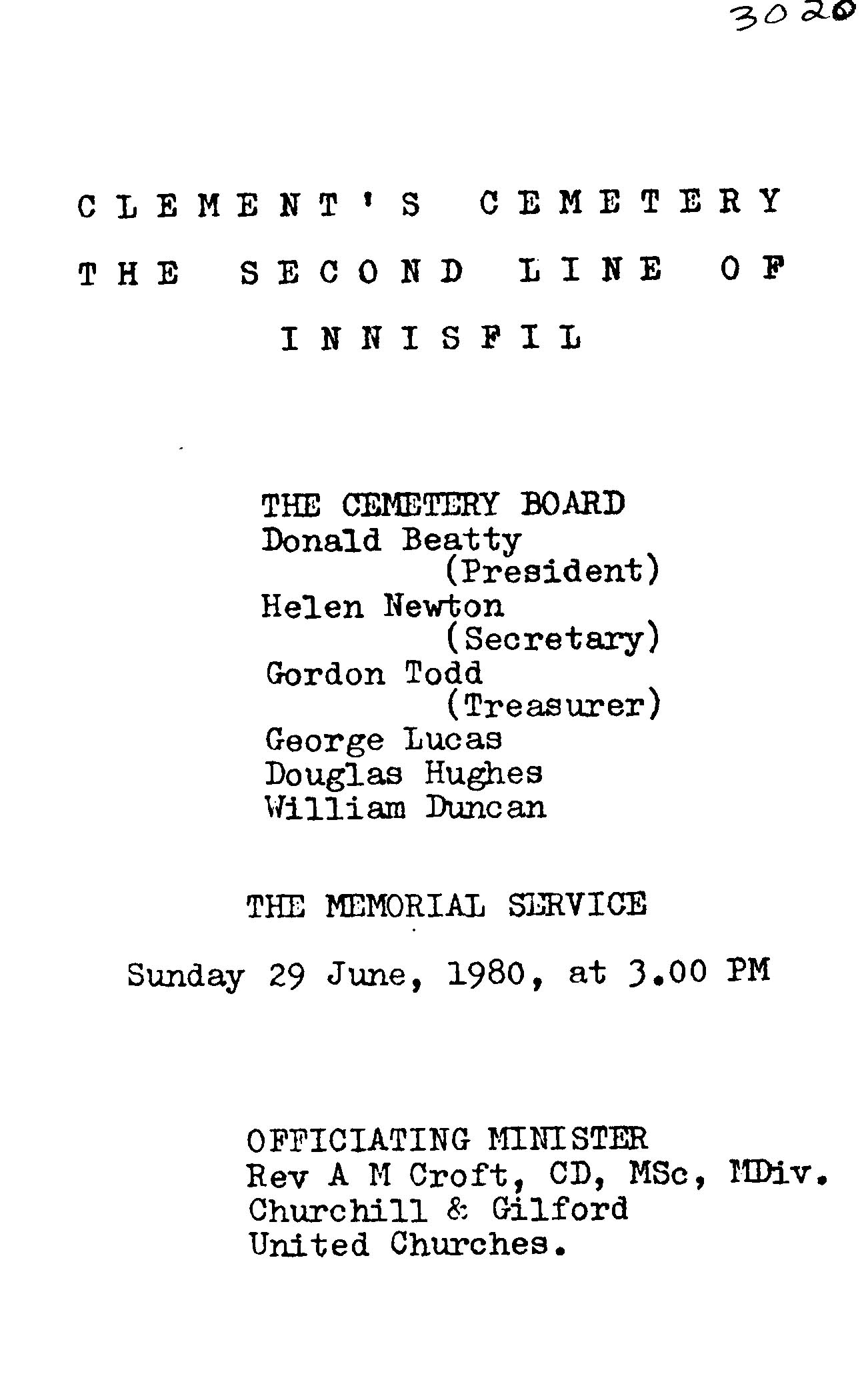 Scan of the front page of a Memorial Service at Clement's Cemetery on the Second Line of Innisfil. The officiating minister was Rev. A.M. Croft, CD, MSc, MDiv, of the Churchill and Gilford Churches. The Cemetery Board consisted of Donald Beatty (President), Helen Newton (Secretary), Gordon Todd (Treasurer), George Lucas, Douglas Hughes, and William Duncan. The service took place on Sunday 29 June 1980 at 3:00 p.m.