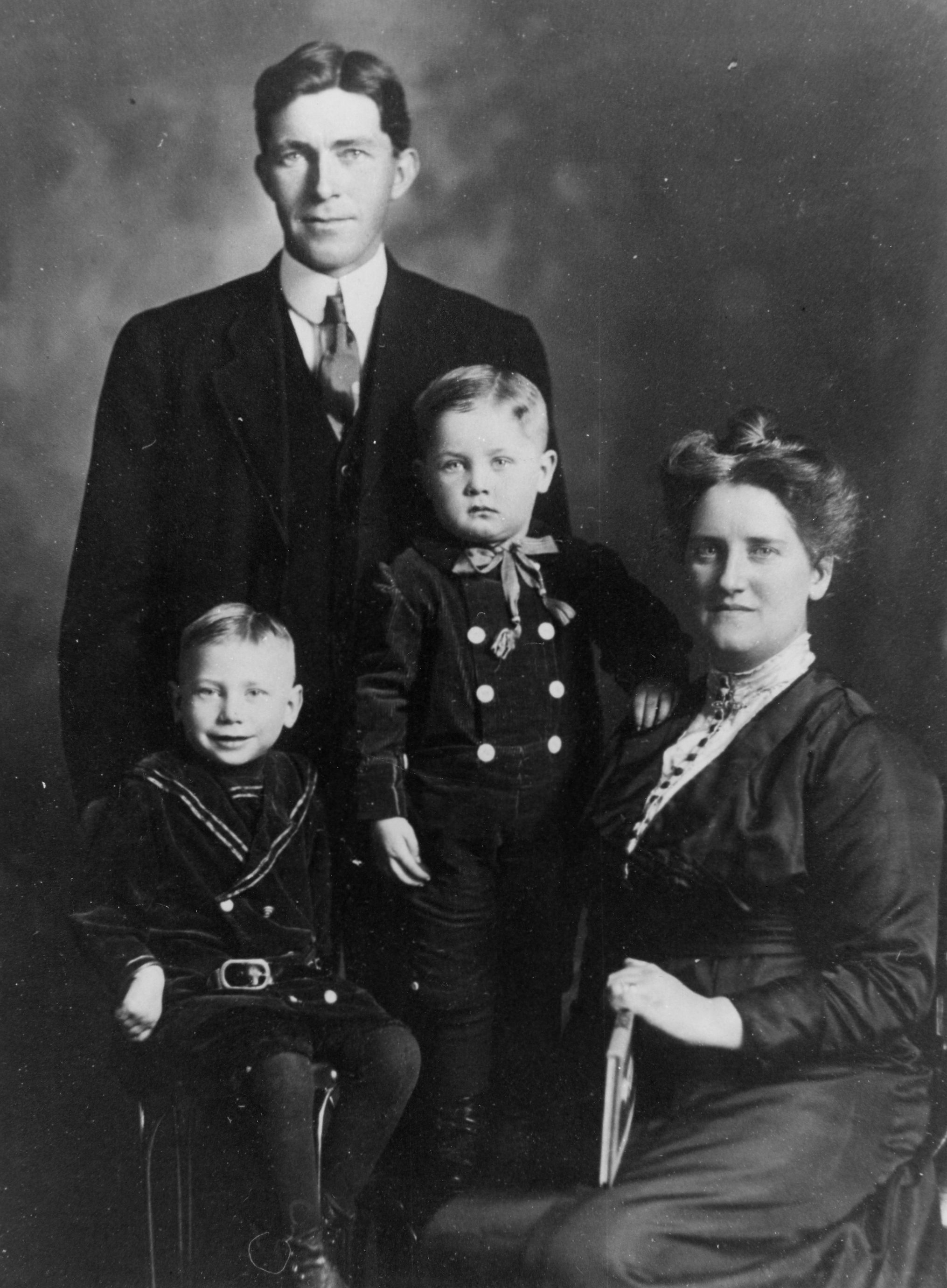 Mr. Wilfred Stewart (1882-1974) and his wife Ellen May Cross (1882-1954) of Churchill and their children Wallace (left, 1911-1944), and Mac (right). Wilfred worked as an assessor and tax collector in Innisfil for thirty years, beginning in 1925. He also farmed for many years in Tyrone before retiring in Lefroy. He also acted as a church elder at the Churchill United Church and served as a Sunday School superintendent for 16 years. Wilfred's second wife was named Bertha Thompson (née Atkinson).