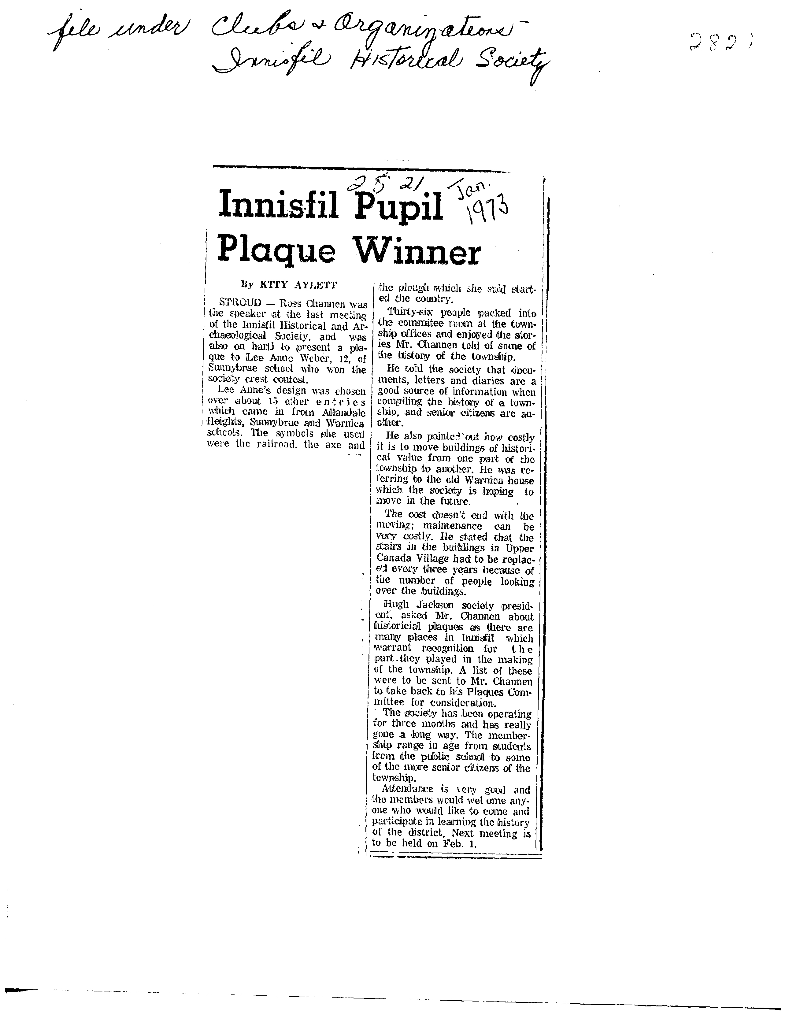 Clipping from Barrie Examiner. Innisfil pupil plaque winner, Lee Anne Weber.