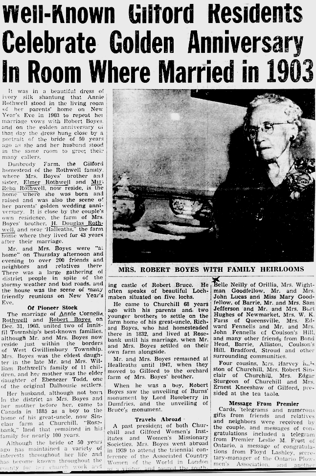 Newspaper copy of Golden Wedding Anniversary of Robert and Annie (Rothwell) Boyes - Dec. 31, 1953 Social events - Golden Wedding Anniversary Robert Boyes Annie (Rothwell) Boyes