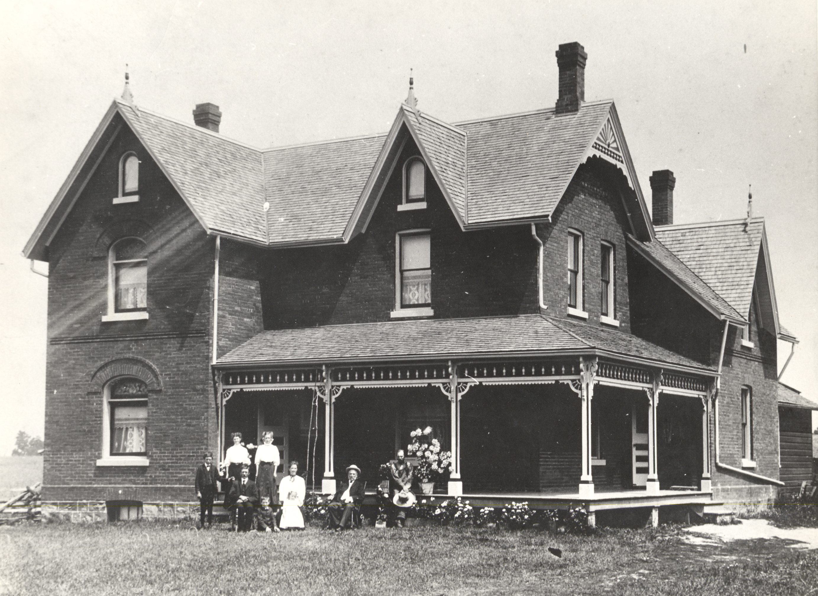 Wellington Webb and family - wife Clarisa (nee Vanderburgh) (l to r): Son Albert, daughter Florence (Mrs. Blythe McConkey), son Cecil (seated), Clarisa, small girl probably Noreen Plant, Mr. Pim seated in rocker, hired man unknown, probably Ernie Denton Housing and residences Albert Webb Florence Webb Cecil Webb, Clarisa Webb