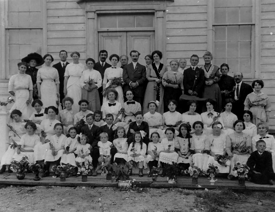 Elsie Nelson Music Festival of 1905 at Lefroy Presbyterian Church (where present school is across from United Church Back row left to right: ------, Mr. White, -----, ----,----,----,---- Second back row l to r: Birdie Cross, Edith Woods, Mabel Reid, Mrs. Frank Whan, Mrs. Addison, Rev. Addison, Elsie Nelson, Mary Cowan, Donald Cowan,Mrs. Cowan, Mrs. Tom Reid, Tom Reid, Lulu McCullough Third row l to r: Flora Neelands, Bell Neelands, Hester Black, Sadie Leonard-(Green),----,----,----,----,----, Lydia Jack, Edith Northgreaves, ---Sturgess, Jean Nelson Front row: Nelson family Costumes and clothing, Social Event (music festival) Churches - Presbyterian