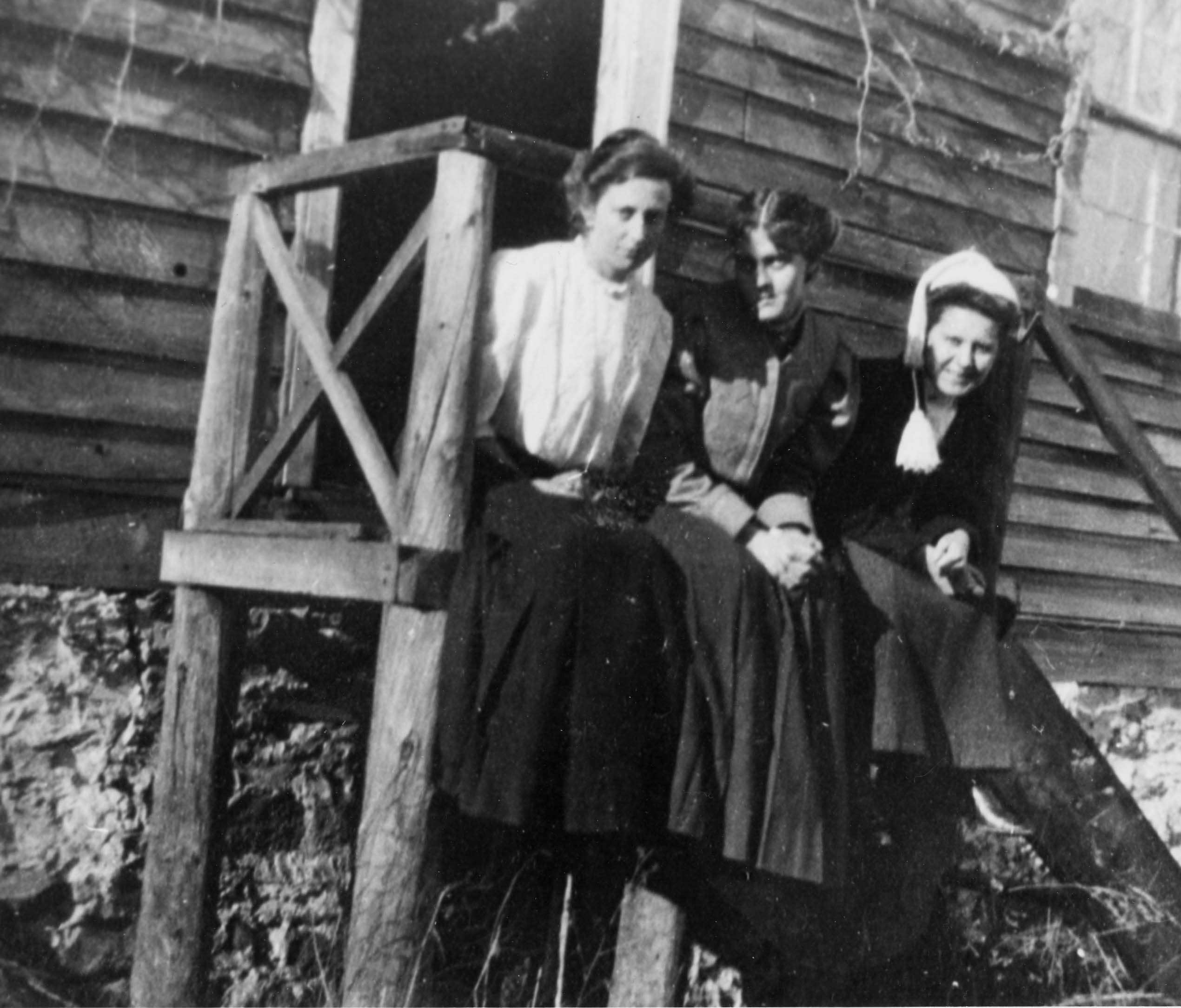 Old James Sloan home and store and post office (first post office in village).This was in southwest corner of Churchill. In later years was a harness shop, barbershop, shoemaker's shop, library, township office Demolished c.1947 In early years this building was used for exhibits when Innisfil had a fair. (L to r): Winnifred Sloan, Edith Wilson, Eveleen Sloan at south door of house. Costumes