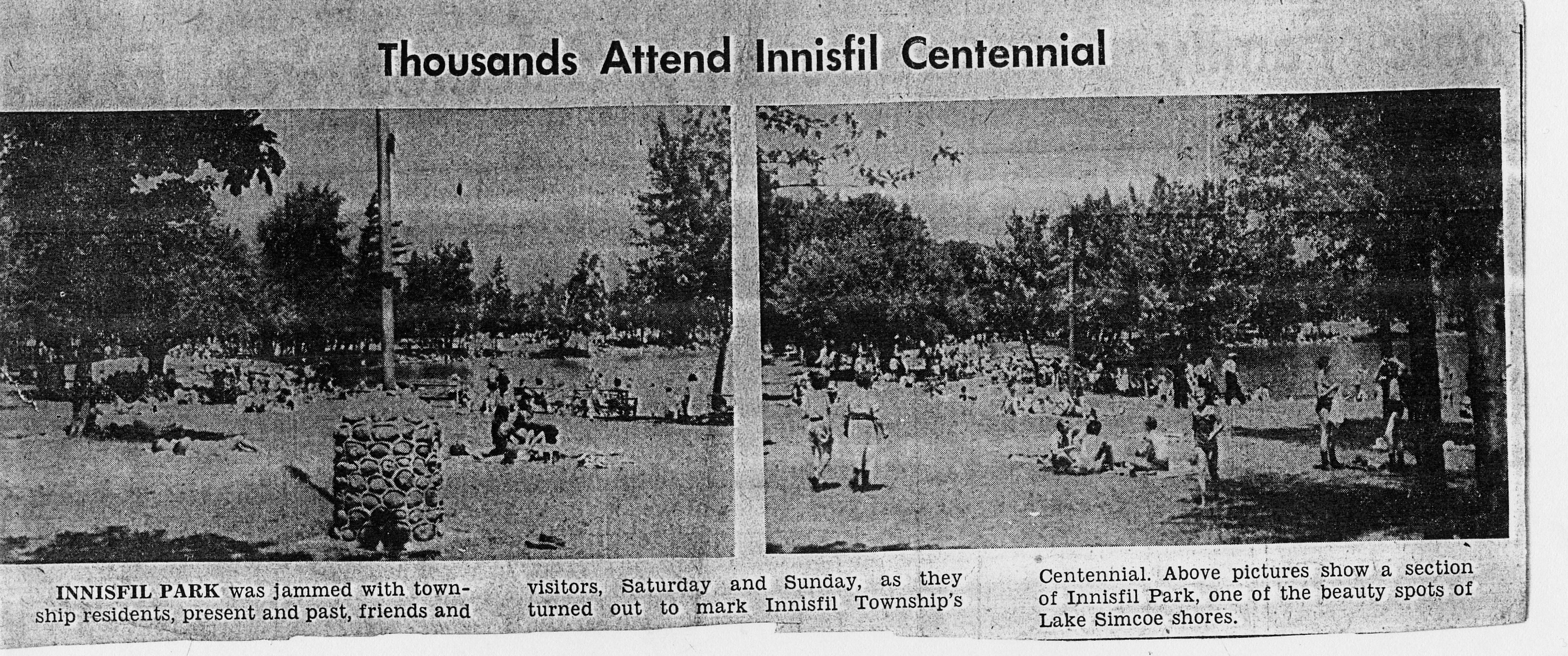 Clipping from the Barrie Examiner featuring a photo and brief description from the celebrations in honour of the Township of Innisfil's Centennial year in 1951. The photo shows a significant crowd of people at Innisfil Beach Park with a caption that reads: "Innisfil Park was jammed with township residents, present and past, friends and visitors, Saturday and Sunday, as they turned out to mark Innisfil Township's Centennial. Above pictures show a section of Innisfil Park, one of the beauty spots of Lake Simcoe shores." The article is entitled "Thousands Attend Innisfil Centennial."