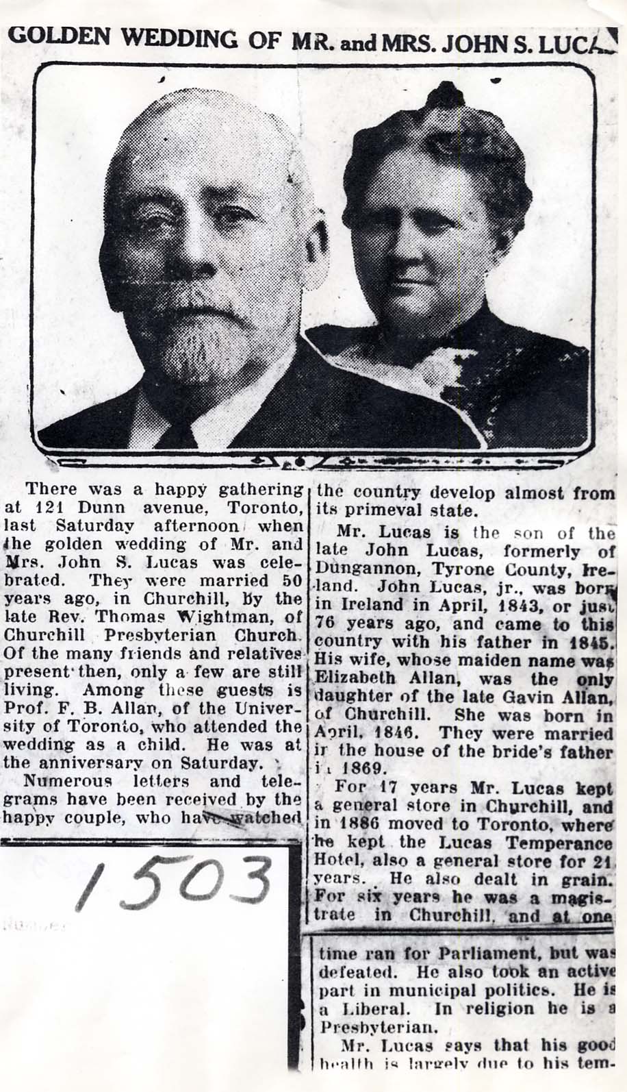 Newspaper clipping Mr. and Mrs. John S. Lucas (1869-1919) Golden Wedding Anniversary John S. Lucas-born in Ireland 1843 (came here with his family (parents)- to SH Lot 18, Conc.5) Elizabeth Allan, his wife, born 1846 at Churchill -married at Churchill note: Reverend Thomas Wightman was minister of Sixth Line Presbyterian church NOT- Churchill Presbyterian church as stated in clipping. Further information is available at the Knock Heritage Site