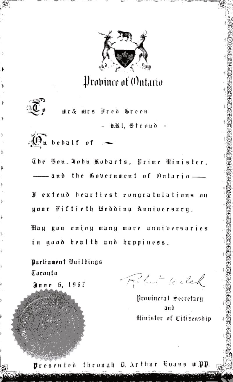 50th Wedding Anniversary Congratulations from the Province of Ontario. Presented through D. Arthur Evans M.P.P. to Mr. and Mrs. Fred Green (Mr. Green has now been deceeased 8 years). They were married in 1917. The Hon. John Robarts, Prime Minister, and the Government of Ontario, Parliament Buildings, Toronto.