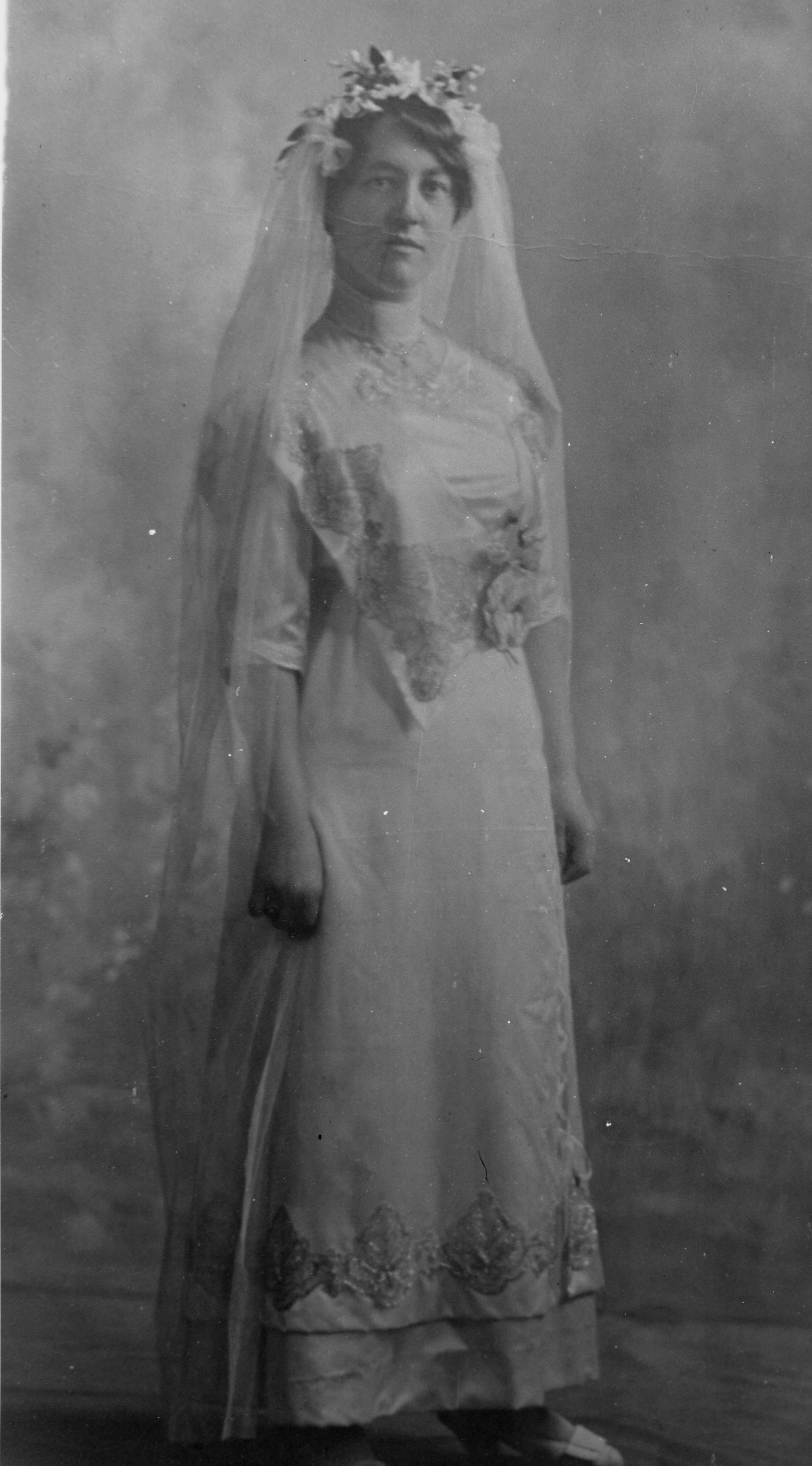 Mrs. Howard Allan, nee Edna Sturgeon, on her wedding day February 6, 1913. Her wedding dress has been donated to the Simcoe County Museum by her family.