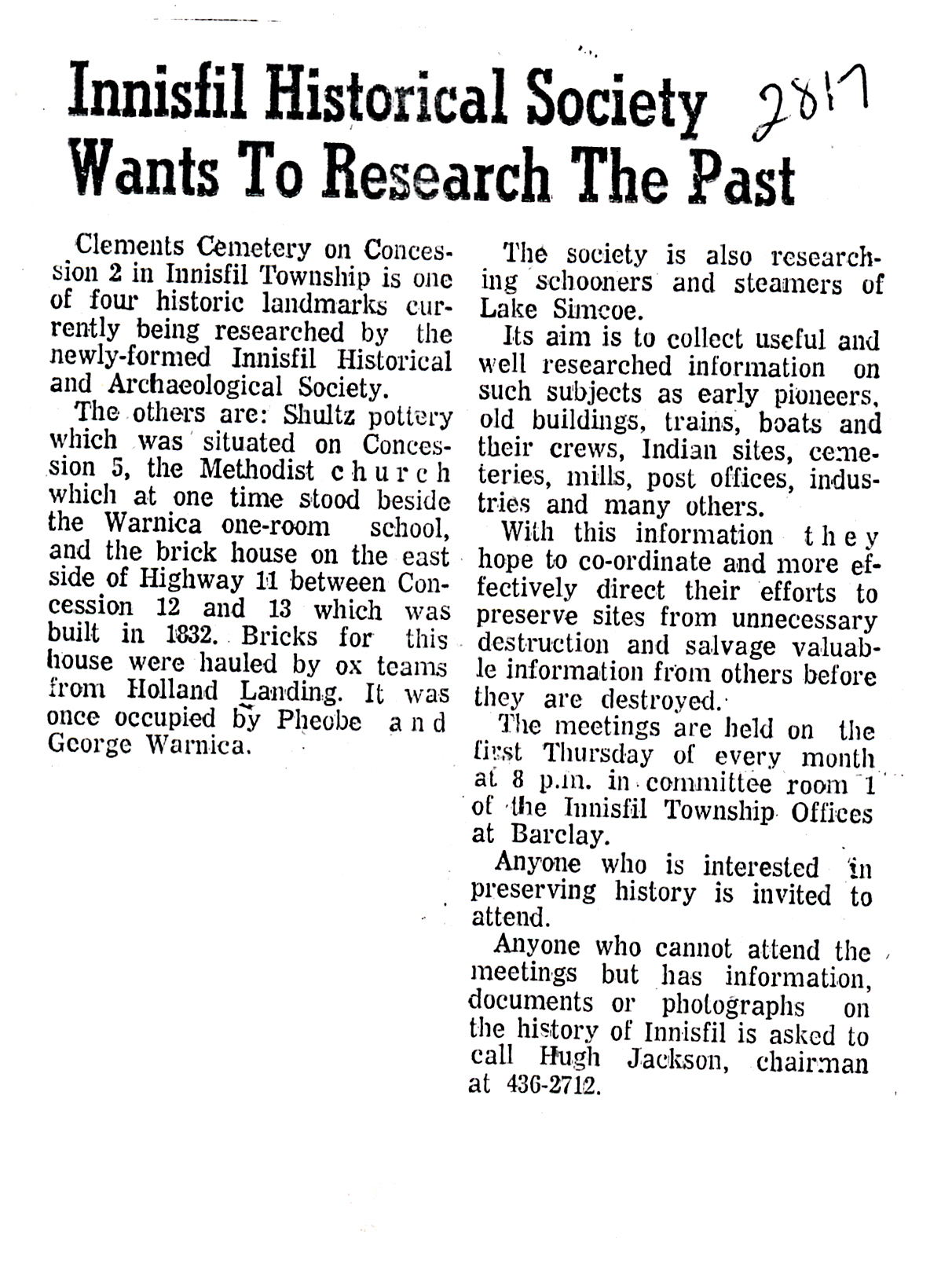 Copy of a newspaper clipping from the Barrie Examiner in 1974 entitled "Innisfil Historical Society Wants to Research the Past." The article discusses the Society's interest in finding out more about four local landmarks: Clements Cemetery on Concession 2, Shultz Pottery on Concession 5, the Methodist Church that stood beside the one-room Warnica school, the Warnica house on the east side of Highway 11 between Concessions 12 and 13, as well as the schooners and steamers of Lake Simcoe. The article also mentions that the Society hoped more research would enable them to better co-ordinate and more effectively preserve sites from destruction or at least salvage information before they were destroyed. Hugh Jackson is listed at the Society's Chairman.