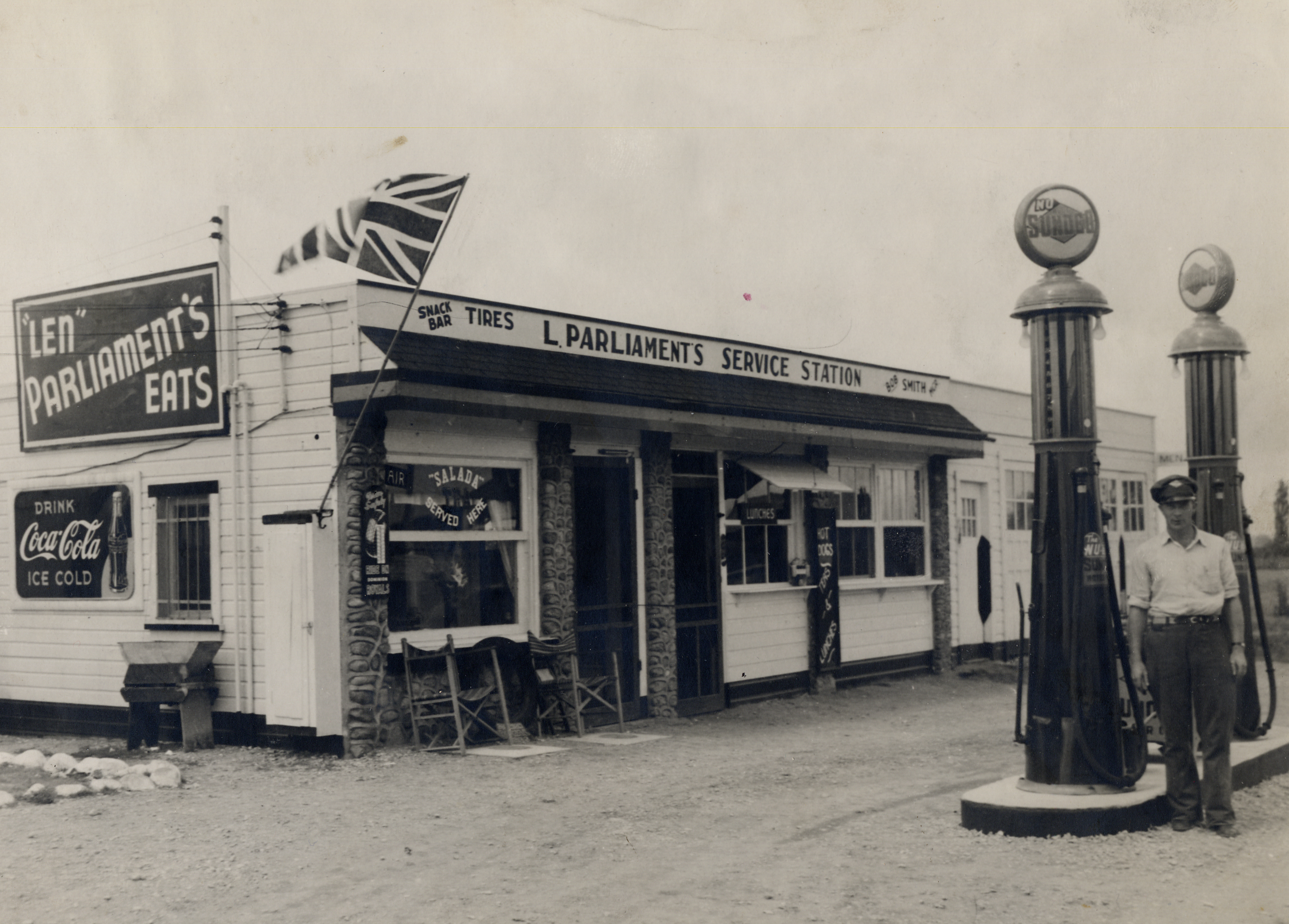 Service Station bought from Ivan Klooey in 1940 by Parliaments - operated by Bob and Marie Smith until 1964. Sold to Peter Isles. Bob Smith in photo served Sunoco Gas, meals, tires etc. Garage - Service Station Bob Smith, Marie Smith Parliaments, L.; Isles, Peter, Klooey, Ivan