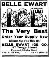 A newspaper advertisement for the Belle Ewart Ice Company that reads: "BELLE EWART ICE The Very Best Order Your Supply