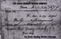 Notice of shipping of one dozen champion Knife Grinding Machines by N. Ry. to Craigvale from The Sickle Grinding Machine, IHS3105 B