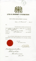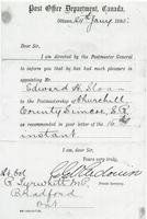 Letter of appointment to Postmastership for Edward Sloan of Churchill dated March 18, 1895, IHS 4492