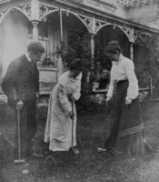 Croquet played on the Beatty homestead lawn. The man of the left is unidentified, and the two ladies are unidentified, IHS883