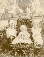 Portrait of three young children in gowns posed outdoors around an antique chair. From left to right are Durbin Nixon,