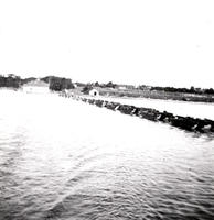 Photograph of the breakwater in Lake Simcoe at Belle Ewart. The water is calm and there are some buildings visible along, IHS419