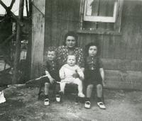 Bertha Thorne Noon with Margaret, Bill and Anne sitting at front of small home owned by Ashley Moore and Annie Thorne, IHS 4356