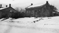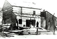 Photo of a two-storey log house built about 1845 and taken just prior to being demolished in 1906. In the picture are, IHS1723