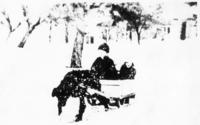Two children, Charles and Isobel Lucas, ride in a snow sleigh pulled by the "Goodfellow dog", Major. Overexposure, IHS156