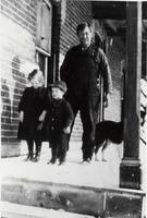 Candid photo of Thomas Irving (born 1850) standing on the porch of his home on the 11th line, just behind his two young, IHS2378-12