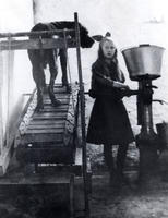 Isabel Goodfellow (later Mrs. Wilfrid O. Jacks) and Major the dog operating a treddle separator on the Goodfellow farm, IHS151
