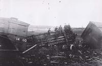 This train wreck occurred on the CNR line, about 1/3 of mile north of Con. 6 in Innisfil. S.H. Lot 22 Con.6, IHS3573