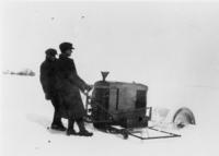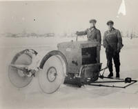 Photo of Calvin Boyd and Fred Quantz cutting ice with a large motorized double-bladed saw for the Lake Simcoe Ice, IHS309