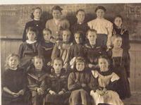 Class photo of Craigvale School, S.S. #11 circa 1912. Taken inside the classroom, in front of the blackboard, with three, IHS106