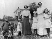 Photo of some of the MacKay family standing on the grassy field in front of Webster's Store in Belle Ewart on the corner, IHS435
