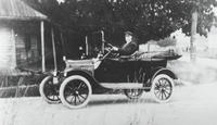 William Reid and his first automobile, circa 1915. The Craigvale Presbyterian Church is in the background, right side., IHS3844