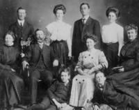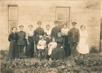 Picture shows women, men (in uniform) and children of the Trumbley and Taggart families, standing in front of a block