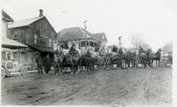 Photo taken of the men and horse-drawn wagons assembled for 'chopping day' in Cookstown. The old drugstore can be seen,