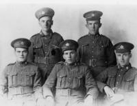 Group photo of five uniformed soldiers, including Harry Farrier of Bell Ewart in the back right. Mr. Farrier was a, IHS2453