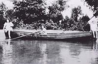 Photo of three young Forster girls in a long canoe on the shore of Lake Simcoe. Sitting on the bow is Madeline Forster, IHS3649