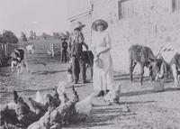 Photo from 1916 of chicken feeding time at the Wright homestead in Stroud. Pictured are Laura Wright (née McLachlen), IHS3405