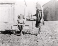 Black-and-white photograph of two young girls in a farmyard. One girl is seated in a small four-wheeled cart with text, IHS810