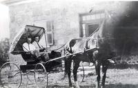 Photo of the Donnelly family in a two-seater Democrat, a type of horse-drawn carriage. Pictured in the back seat from, IHS591