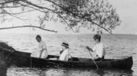 Candid photo of a canoe with three passengers off of Killarney Beach, near Concession 4 of Innisfil. There are two, IHS1590