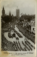 Postcard depicts hundreds of soldiers marching the streets of London, England celebrating the Allied troops' victory in, Digital Only