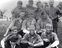 Outdoor group photo of the Knock Men's Baseball Team at Killarney Beach Park in 1920. The men are posed in three rows, IHS1780