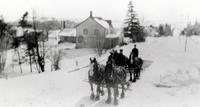Photo of a horse and cutter in the snow, north of the Presbyterian Church (now United) in Churchill. The snow is quite, IHS2670