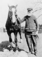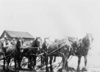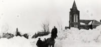 Photo of John Boyes II, road foreman, clearing snow with two teams of horses in front of the Churchill Presbyterian , IHS2669