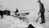 Photo of a man in a fedora and boots holding a handsaw and standing on a portion of ice. A horse drawn sled, loaded with, IHS1842